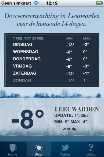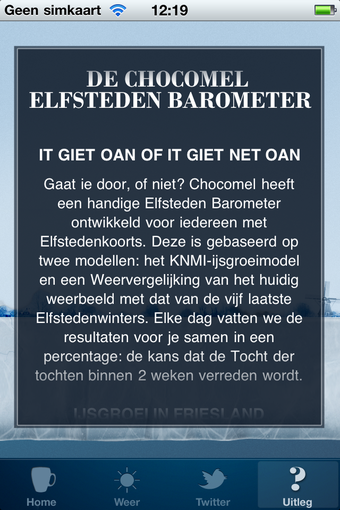 De Chocomel Elfstedentochtbarometer geeft aan hoe groot de kans is dat de schaatstocht binnen de komende 2 weken gehouden gaat worden. In de bekende gele mok staat in procenten aangegeven of we onze schaatsen al uit het vet moeten halen. Verder zie je de weersverwachting voor de komende week en een Twitter-feed waarin alle tweets over de Âlvestêdetocht staan verzameld.